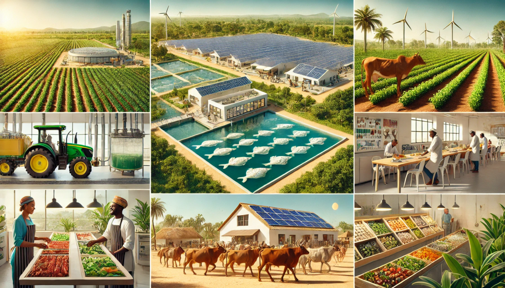 Les produits offerts par Gadio-Agro-Business, mettant en avant des infrastructures agricoles innovantes, des techniques durables, et des activités diversifiées comme l’agriculture, l’élevage, l’aquaculture, le commerce et la transformation